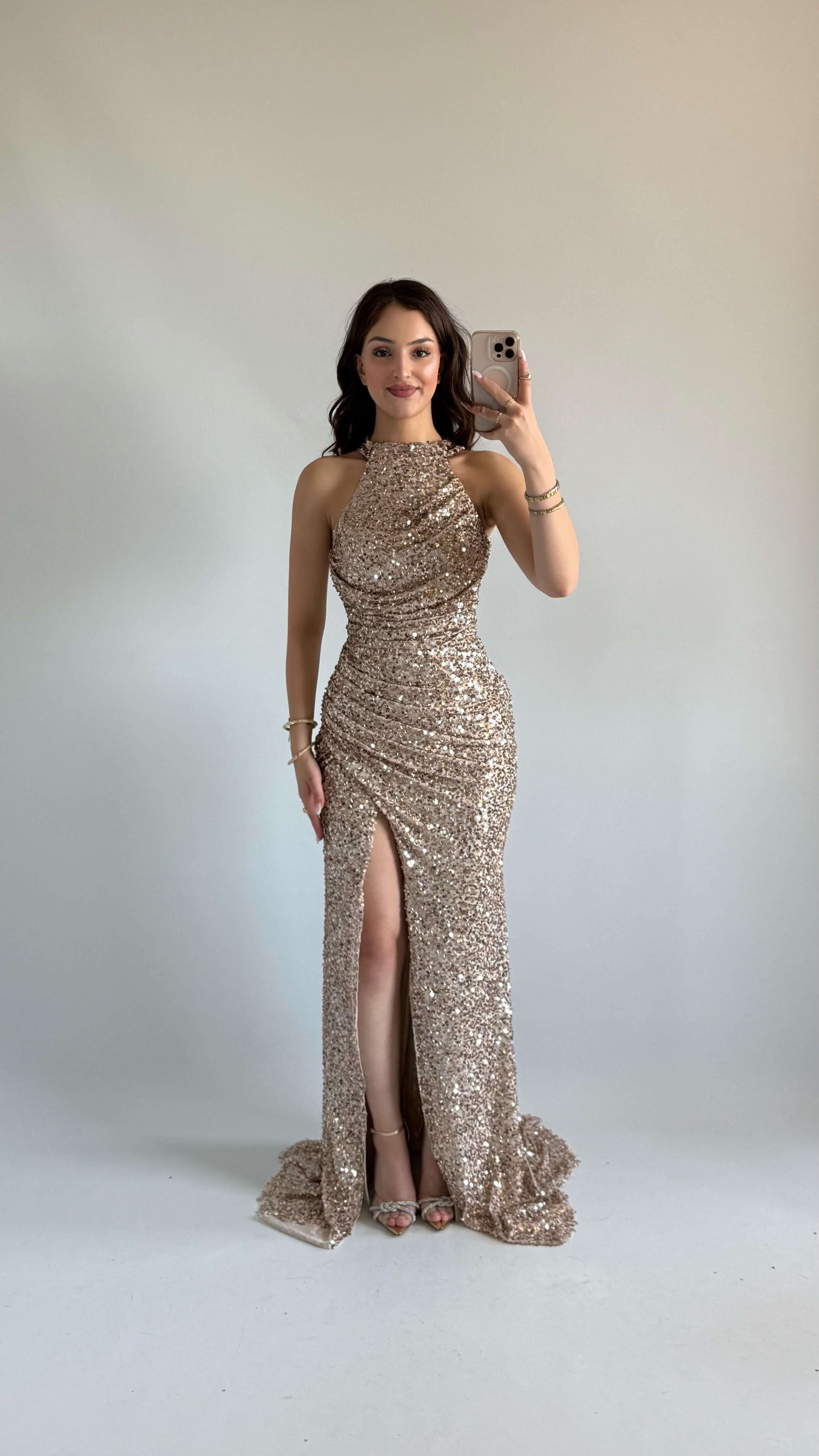 Donatella Yırtmaçlı Abiye Rose Gold (113973)