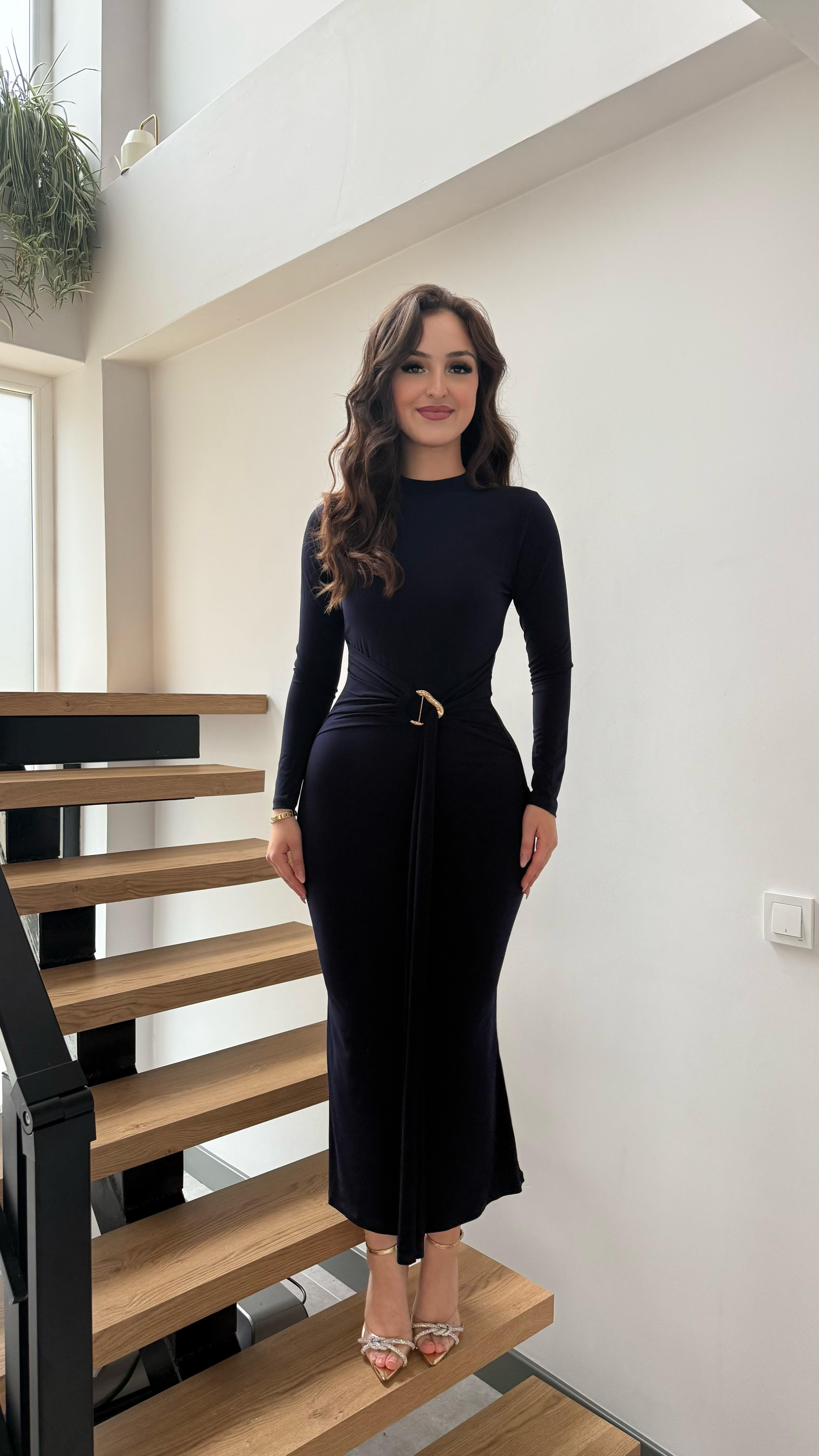 Gold Toka Kuşaklı Maxi Elbise Lacivert (114367)