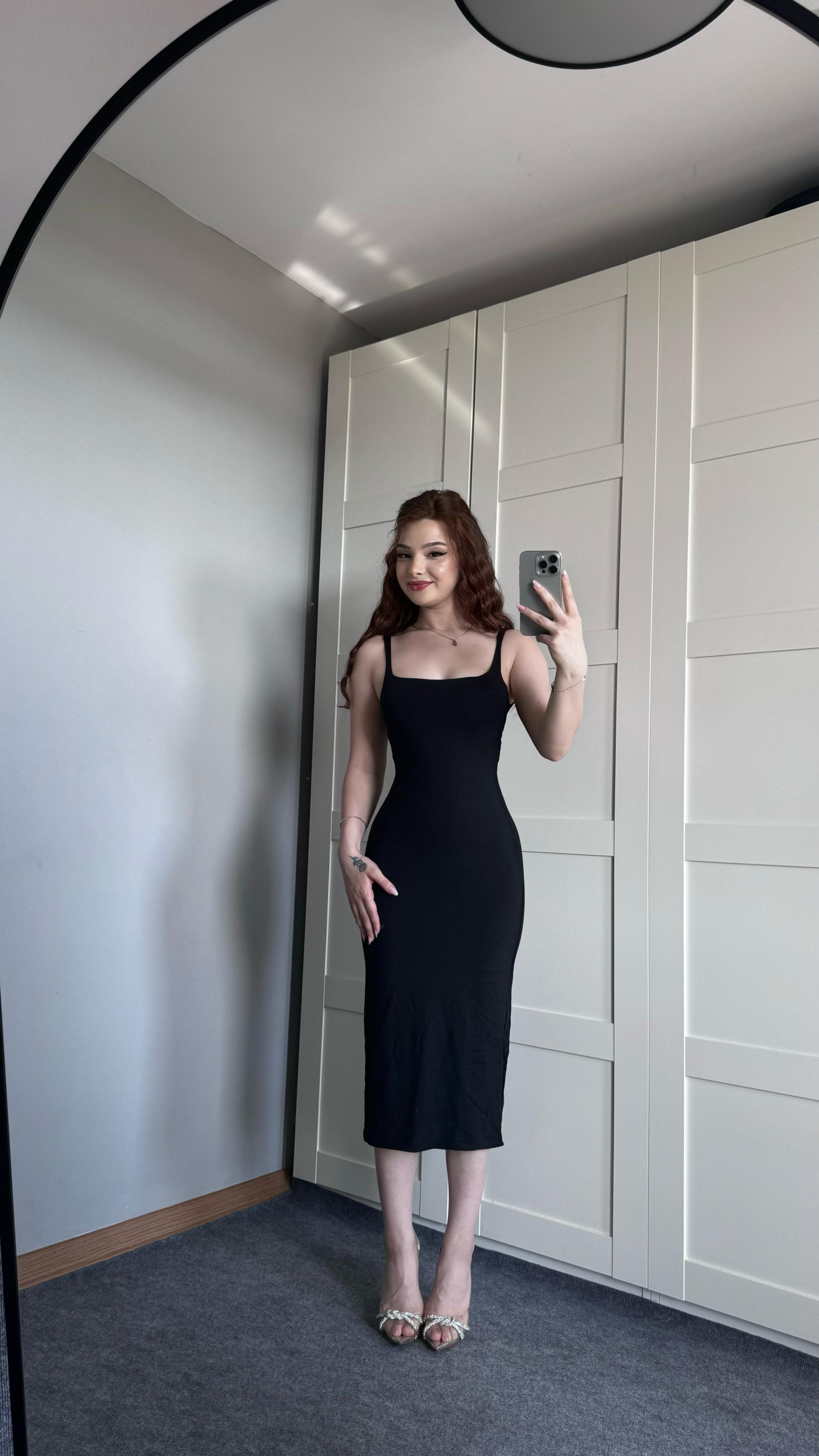 Kare Yaka Askılı Midi Siyah Elbise (111-235)