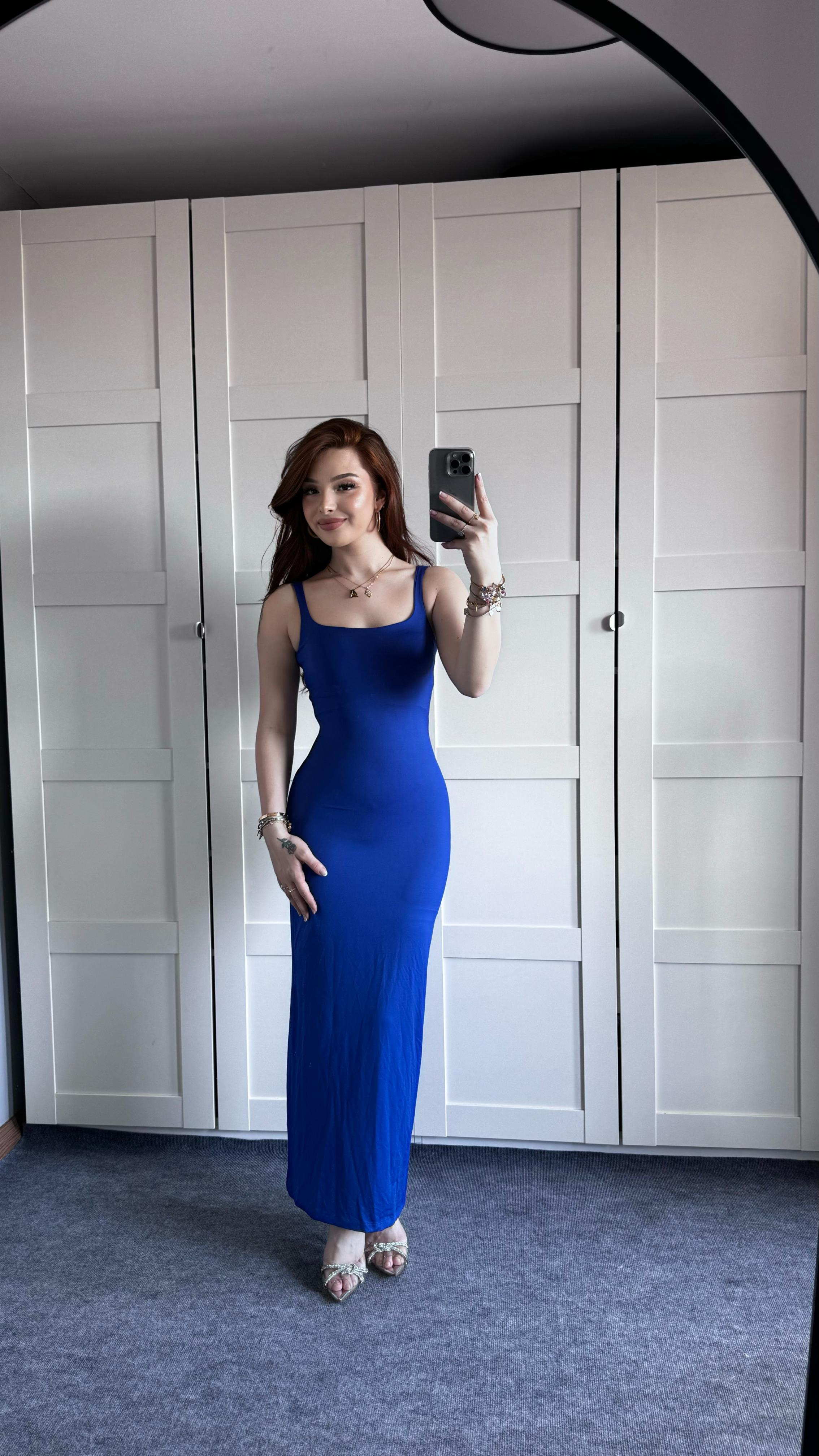 Kare Yaka Kalın Askılı Saks Mavisi Uzun Elbise