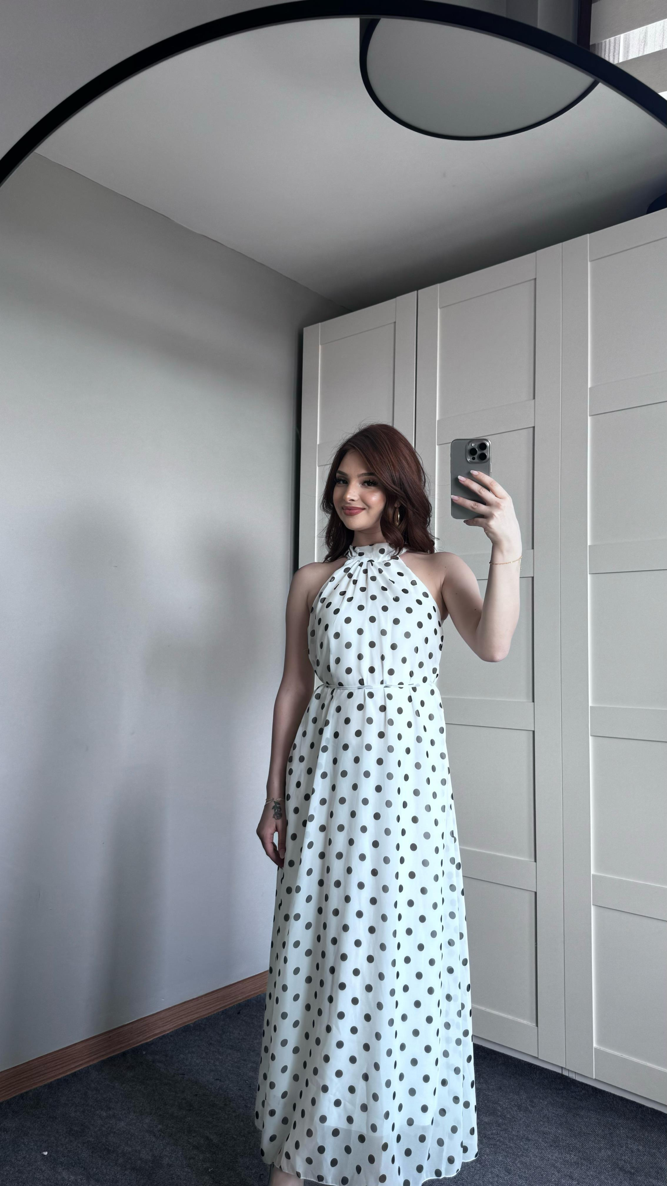 Puantiyeli 90's Boyun Detaylı Beyaz Elbise