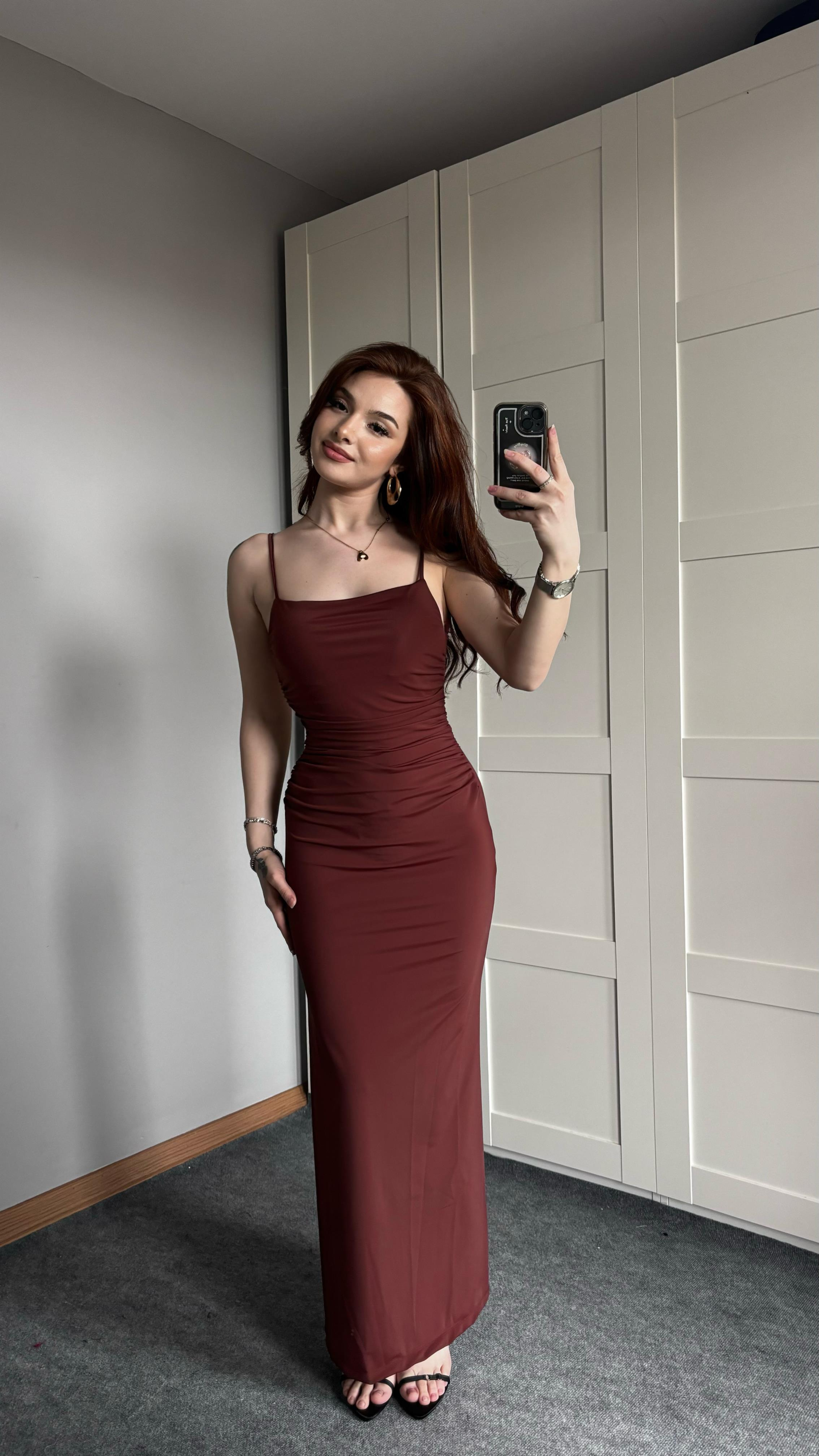 Sırt Dekolteli Büzgülü Kiremit Elbise,
